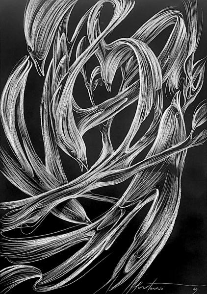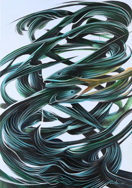 Pantonio est depuis toujours influencé par le fleuve Tage qui traverse le Portugal. Il crée au pinceau des personnages, des animaux fantastiques, des lapins, des poissons, des tortues, toujours en mouvement. On y aperçoit parfois des traits façon cordages qui évoquent la pêche et le monde marin si cher à la tradition portugaise. L’utilisation volontaire de quatre couleurs dominantes, bleu, noir, blanc et rouge, n’est pas sans rappeler le bleu sombre de la mer, le noir des fonds marins et le rouge volcanique du centre de la Terre.